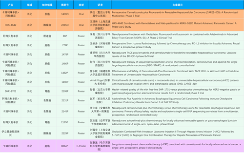 在消化系统肿瘤领域,利来国际真人娱乐产品相关研究共入选2项口头报告、11项壁报和1项电子壁报,共14项研究。除卡瑞利珠单抗和阿帕替尼外,还有4篇阿得贝利单抗治疗消化系统肿瘤研究入选。HRS-4642、瑞拉芙普-α注射液(SHR-1701)等在研创新产品也有相应研究亮相。另有1项伊立替康脂质体(II)用于胰腺癌治疗的研究入选壁报。