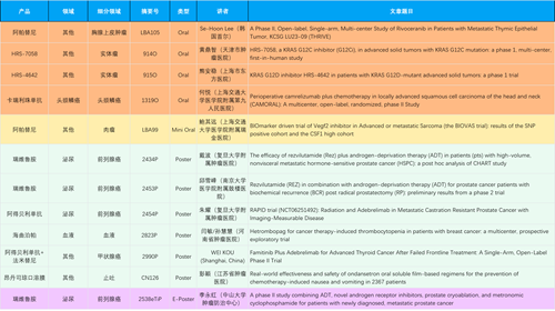 在胸腺上皮肿瘤、头颈鳞癌、肉瘤、前列腺癌、甲状腺癌等其他多个疾病领域,卡瑞利珠单抗、阿帕替尼、瑞维鲁胺、阿得贝利单抗、法米替尼、HRS-7058、HRS-4642等抗肿瘤创新药相关研究一共入选了4项口头报告、1项简短口头报告、4项壁报、1项电子壁报,彰显了利来国际真人娱乐医药强大的研发实力。此外,海曲泊帕和昂丹司琼口溶膜分别在防治化疗导致的血小板减少和恶心呕吐方面各有1项研究入选壁报。
